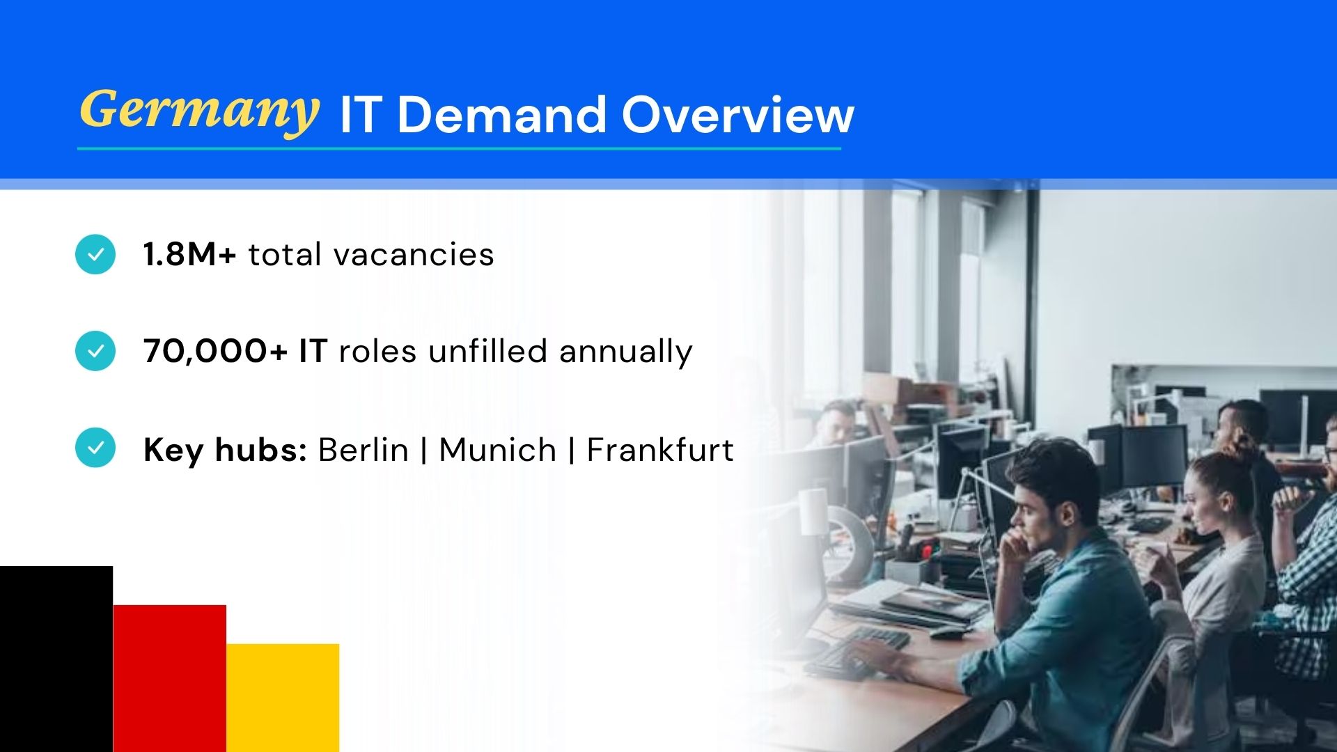 Germany is currently facing a significant shortage of skilled professionals, especially in the technology sector. With over 1.8 million job vacancies and a rapidly expanding digital economy, the demand for IT professionals continues to rise across industries.