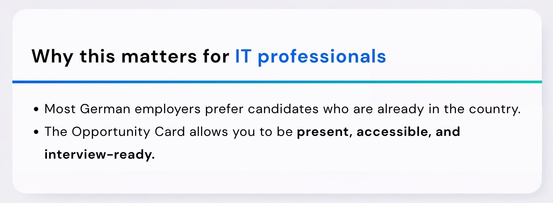 To address this gap, Germany introduced the Opportunity Card (Chancenkarte) — a structured pathway that allows professionals to enter Germany without a job offer and search for jobs directly within the country.